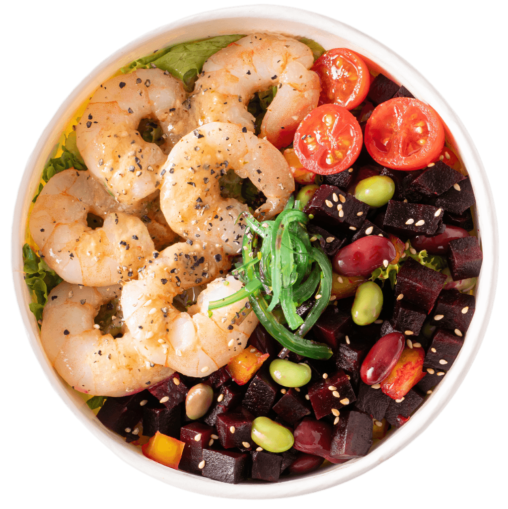 Herb Mustard Shrimp, Beetroot, Yellow Bell Pepper, Red Kidney Beans, Kale, Edamame with Salad Dressing