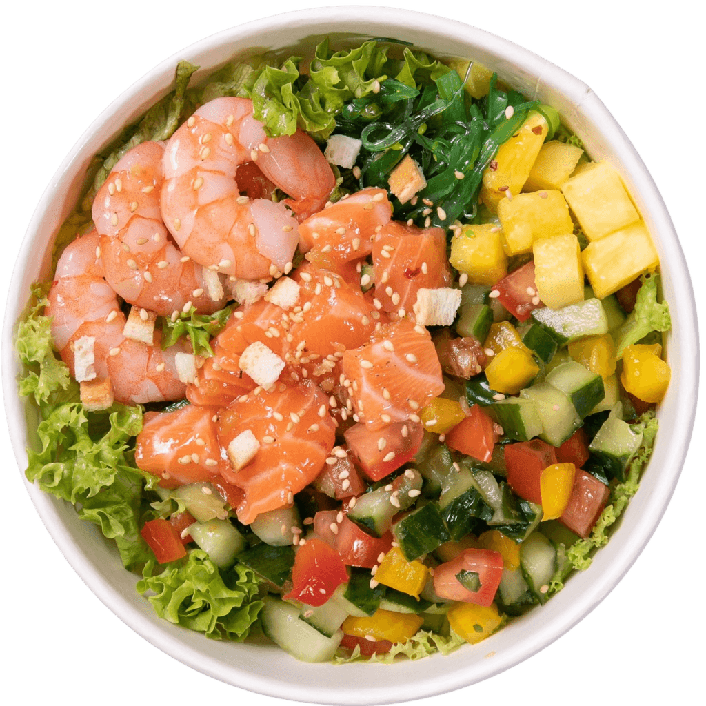 Tapas Garlic Salmon, Tapas Garlic Shrimp, Tomato, Cucumber, Red & Yellow Bell Pepper with Homemade soy sauce